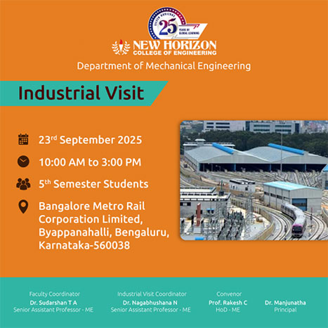 CO-CURRICULAR ACTIVITIES Industrial visit to Bangalore Metro Rail Corporation Limited (BMRCL) On 23rd September 2025, the Department of Mechanical Engineering organized an industrial visit to Bangalore Metro Rail Corporation Limited (BMRCL), located at Arabic College Main Road, Venkateshapura, Bengaluru. The visit, attended by 5th semester students and accompanied by Dr. Nagabhushana N and Dr. Hemanth […]