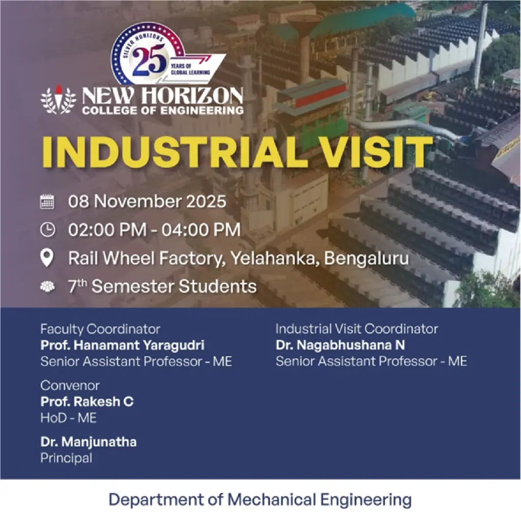 CO-CURRICULAR ACTIVITIES Industrial Visit to Rail Wheel Factory Event Title: Industrial Visit to Rail Wheel Factory, Yelahanka Date: 08th November 2025 Department: Mechanical Engineering Accompanied by: Dr. Gopal Attendees: 7th Semester Students Duration: 02:00 PM – 04:00 PM Location: Rail Wheel Factory, Yelahanka, Bengaluru – 560064 Overview: The Department of Mechanical Engineering organized an industrial […]