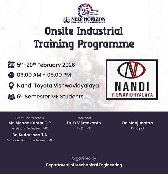 CO-CURRICULAR ACTIVITIES Industrial Visit to Nandi Vishwavidyalaya The Department of Mechanical Engineering organised an on-site industrial training for the 6th semester students at Nandi Vishwavidyalaya from 5th to 20th February 2026. The programme focused on Electric Vehicles, Hybrid Electric Vehicles, and live engine overhauling. Students received hands-on exposure to advanced automotive engine technology and HEV […]