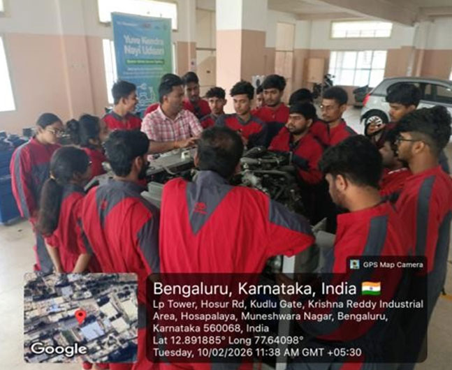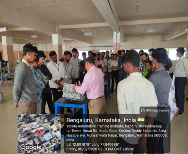 The Department of Mechanical Engineering organised an on-site industrial training for the 6th semester students at Nandi Vishwavidyalaya from 5th to 20th February 2026. The programme focused on Electric Vehicles, Hybrid Electric Vehicles, and live engine overhauling. Students received hands-on exposure to advanced automotive engine technology and HEV Systems. The training covered special tools for engine overhauling with real-time case studies using advanced diagnostic tools.