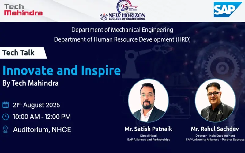 A tech talk titled “Innovate and Inspire by Tech Mahindra” was conducted for the V Semester Mechanical Engineering students at the Auditorium. The session aimed to provide valuable insights into SAP solutions and their integration with Tech Mahindra’s operations, while also creating awareness about the essential skills, traits, and learning paths required to build a successful career in leading technology companies.